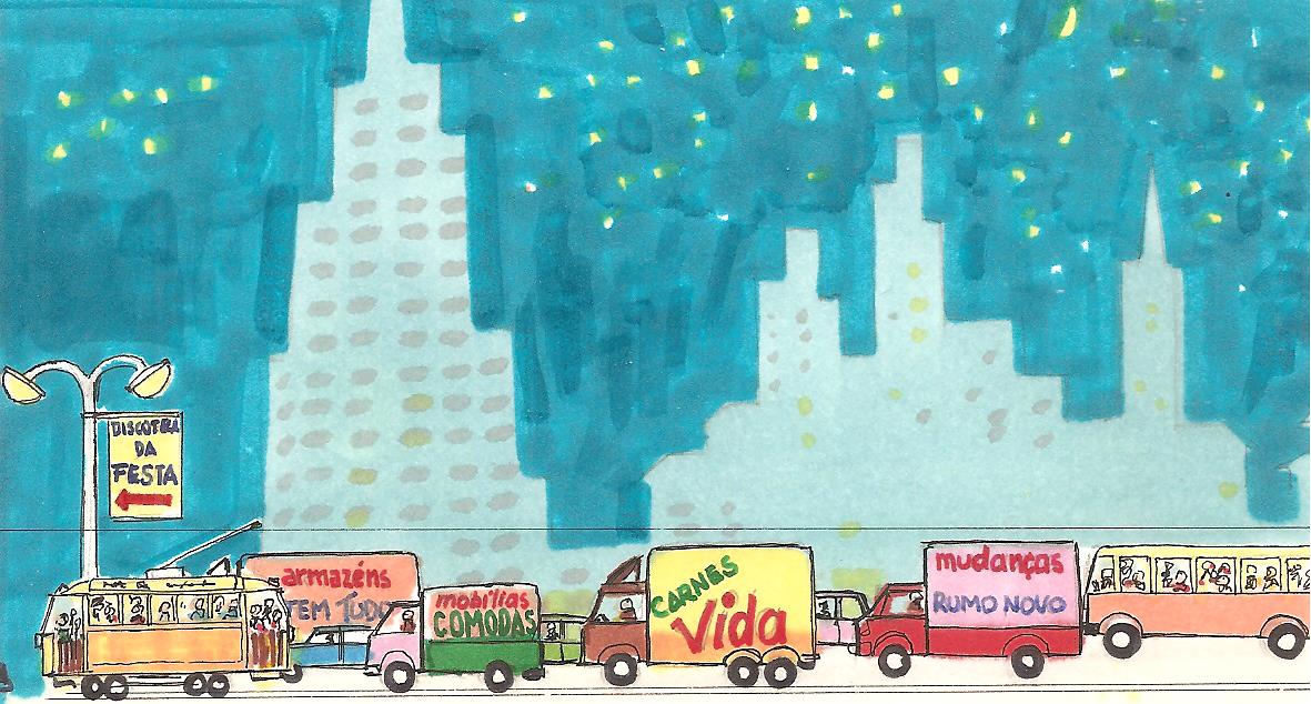 Noutra vinheta, observa-se o movimento urbano (transportes públicos e particulares, transporte de bens) e indicação da discoteca da festa. Em fundo, que eu apreciei muito quando Henrique Leorne me mostrou o conjunto dos desenhos, uma cidade de prédios elevados e muitas luzes, a indiciar uma pujante vida urbana. Curiosa, porque datada num tempo, a vinheta do cliente ir à loja de computadores reservar uma mesa para a festa. Hoje, far-se-ia online (em linha). Na mesa ao fundo, um empregado da loja escreve num papel; hoje, usaria um tablet ou telemóvel inteligente.