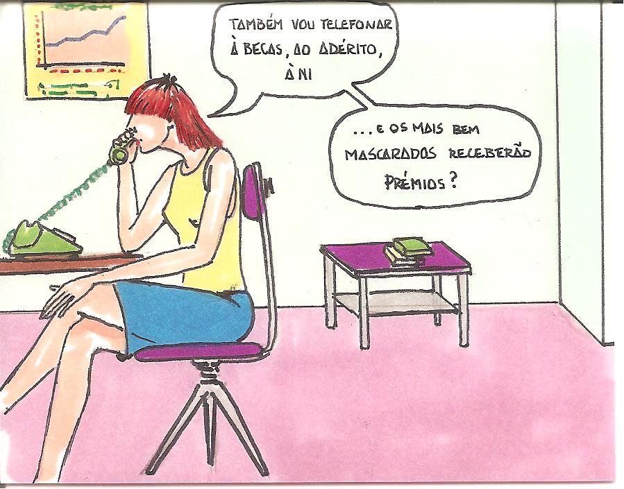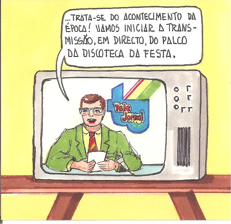 Quando o cliente comenta ir para a festa, a telefonista, ainda vista de perfil, lamenta não poder ir. As horas do seu turno de trabalho coincidiam com as da festa. Na vinheta seguinte, onde se recupera o enquadramento de desenho anterior da banda desenhada, vê-se uma carrinha com panos publicitários a anunciar a festa. Ao fundo, no passeio, de forma estilizada, tipos de figuras: o punk (de cabelos eriçados), o janota (de chapéu alto) e a senhora da sociedade (com estola).