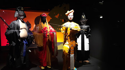 Trajes, maquilhagem e acessórios identificam as personagens. Linhas negras indicam rugas. O branco é para ministros traidores e personagens violentas como generais e bandidos, o vermelho é para homens honestos e fieis, o azul para personagens vigorosas, o amarelo para calculistas, o verde para orgulhosos e o dourado para os deuses. As personagens masculinas dividem-se em idoso, jovem e guerreiro, as femininas em idosa, mulher virtuosa, cortesã ou criada, guerreira e jovem de família distinta. A estas personagens, juntam-se os rostos pintados e os palhaços [texto a partir dos elementos da exposição].